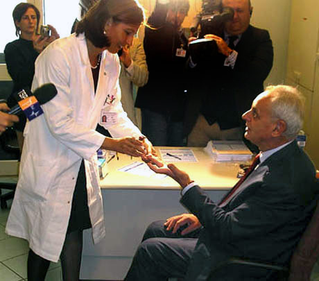 Giornata contro il diabete in Senato: il Presidente Pera durante il prelievo per lo screening glicemico