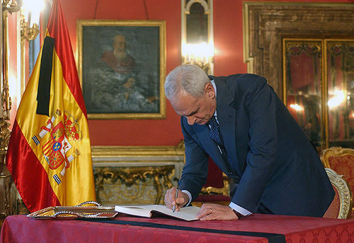 Il Presidente del Senato Marcello Pera firma il registro delle condoglianze nella sede dell'Ambasciata di Spagna, il giorno dopo i gravissimi attentati di Madrid