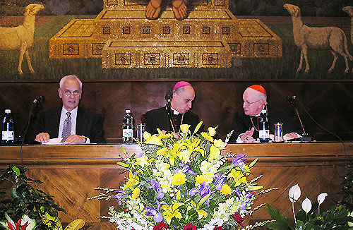 Lezione nell'Aula Magna dell'Universita Lateranense per celebrare i 150 anni della Facolta di diritto civile. Con Pera, al tavolo della presidenza, Monsignor Rino Fisichella, Rettore Magnifico della Pontificia Universita, e il Cardinale Edmund Szoka, presidente dell'Associazione Internazionale Lateranense. Il titolo della lezione di Pera era "il Relativismo, il Cristianesimo e l'Occidente".