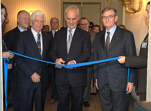 Il Presidente del Senato, Marcello Pera, inaugura la mostra "Il Mediterraneo dei fotografi". Da sinistra, il Direttore dell'Agenzia Ansa Pierluigi Magnaschi, il Presidente dell'Ansa, Boris Biancheri, il Senatore Augusto Rollandin, il Vice Presidente del Senato, Domenico Fisichella e il Presidente della Fratelli Alinari, Claudio de Polo.