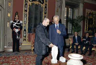 Il Presidente del Senato, Marcello Pera, con le opere in marmo ricevute in dono dai detenuti delle carceri di Trieste e di Milano-Opera, frutto delle attivita lavorative svolte presso i laboratori di scalpellino organizzati nelle case di detenzione.