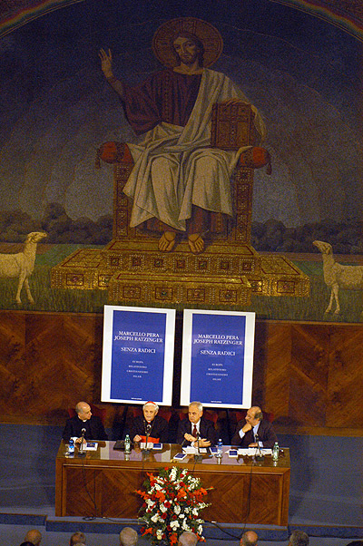 Presentazione del libro "Senza radici. Europa, relativismo, cristianesimo, islam" (Mondadori) nell'aula magna della Pontificia Universita Lateranense. Da sinistra, il Rettore Mons. Rino Fisichella, i due autori del libro, il Cardinale Joseph Ratzinger e il Presidente del Senato Marcello Pera, e il giornalista Pierluigi Battista, moderatore dell'incontro.