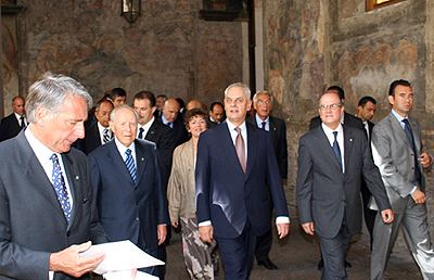 Il Presidente del Senato, Marcello Pera, con il Capo dello Stato, Carlo Azeglio Ciampi, nel chiostro del Convento di S. Maria sopra Minerva, in occasione della relazione al Parlamento dell'Autorita per la vigilanza sui lavori pubblici. Alla sinistra di Pera, il Presidente dell'Autorita, Alfonso Maria Rossi Brigante.