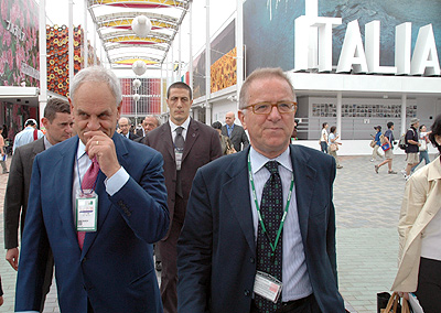 Il Presidente del Senato, Marcello Pera, in visita al Padiglione Italia dell'Expo Aichi 2005 durante il viaggio in Giappone.