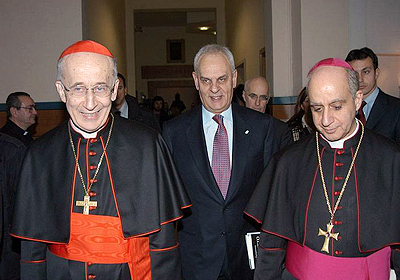 Il Presidente del Senato, Marcello Pera, con il Cardinale Camillo Ruini e Monsignor Rino Fisichella, alla Pontificia Universita Lateranense in occasione della presentazione del libro "Benedetto, padre di molti popoli" di Andrea Pamparana.