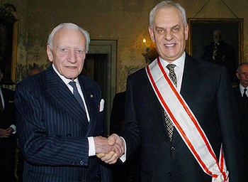 Il Presidente del Senato, Marcello Pera, con il Gran Maestro dell'Ordine di Malta, Fra' Andrew Bertie. Dopo un colloquio privato, nel Salone d'Onore del Palazzo Magistrale il Gran Maestro ha insignito il Presidente Pera della Gran Croce dell'Ordine al Merito Melitense - Classe Speciale - la piu alta onorificenza dell'Ordine di Malta.