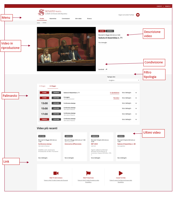 - La parte superiore della pagina di apertura presenta il video trasmesso nello stesso momento anche dal canale satellitare del Senato, oltre che dalla webtv: principalmente le dirette delle sedute di Aula, oppure, in assenza di Aula, dirette di lavori in Commissione, eventi legati all'attività parlamentare oppure filmati di repertorio.